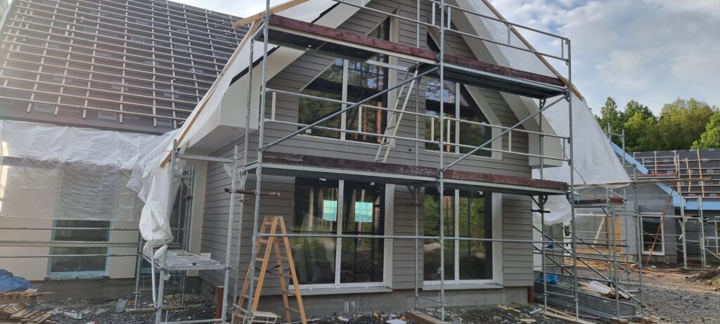 Na Švedskem je naročnik v idilično lokalno okolje postavil pet JUBHome hiš. Tehnično in komercialno usklajevanje se je pričelo že leta 2021, letos spomladi pa so gradbinci pričeli z delom in do poletja spravili pod streho vse hiše. Kljub temu da imajo Skandinavci močnega lokalnega proizvajalca ICF sistemov, se je investitor odločil za našo tehnologijo ne glede na visoke transportne stroške. Verjetno je pomagalo tudi, da je naših korenin saj so vile projektno poimenovane kar po našem gorskem očaku (vile Triglav).